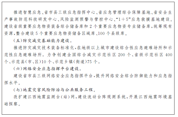 健全完善安全生产责任和管理制度,加快建立公共安全风险排查和隐患治理体系。强化企业主体责任落实,加强危险化学品、烟花爆竹、矿山、建筑施工、交通、消防等重点领域安全生产监管执法,有效遏制重特大公共安全事故。强化生物安全保障,提高食品药品等关系人民健康产品和服务的安全监管水平,强化疫苗等高风险品种监管。建立高效科学的自然灾害防治体系,提升洪涝干旱、森林火灾、地质灾害、气象灾害、地震等自然灾害防御工程标准,推进防灾抗灾重大基础设施建设。完善应急管理体制机制,强化应急管理基础和应急救援队伍建设。加快构建政府、企业、第三方等多方联动的应急物资保障体系,合理确定省级储备和市县级储备、政府储备和企业储备、实物储备和产能储备规模,完善物资储备、动用应急预案。发展巨灾保险。