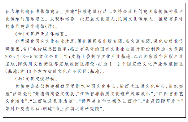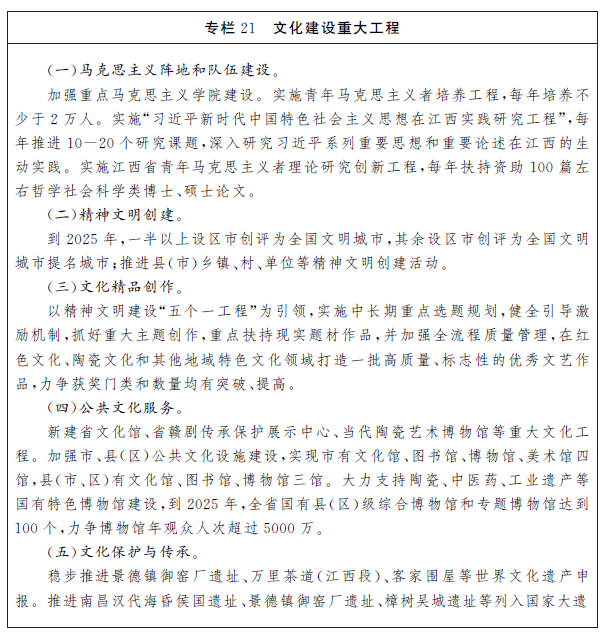 高标准建设景德镇国家陶瓷文化传承创新试验区,努力打造“两地一中心”两地一中心:国家陶瓷文化保护传承创新基地、世界著名陶瓷文化旅游目的地、国际陶瓷文化交流合作交易中心。。全面推进南昌汉代海昏侯国遗址、景德镇御窑厂遗址等国家考古遗址公园建设,构建更具江西特色的考古遗址公园体系和遗址博物馆群。深入开展江西历史文化专题研究阐释,推进书院文化、稻作文化、戏曲文化、中医药文化、阳明文化等特色历史文化传承创新,推动婺源徽州文化、赣南客家文化、景德镇陶瓷文化、吉安庐陵文化、抚州戏曲文化等文化生态保护区(实验区)建设。加强世界文化遗产、重点文物保护单位、历史文化名城名镇名村、传统村落保护和利用。强化非物质文化遗产系统性保护。加强优秀传统手工艺保护和传承。开展赣鄱文化资源普查,深化古籍整理研究。加强地方志工作。启动《江右文库》编纂工程。