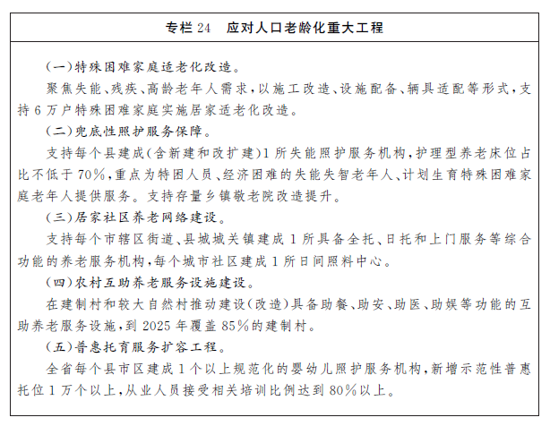推动养老事业和养老产业协同发展,发展普惠型养老服务和互助性养老,支持家庭承担养老功能,构建居家社区机构相协调、医养康养相结合的养老服务体系。健全基本养老服务体系,夯实公办养老院的兜底功能,深化公办养老机构改革,完善公建民营管理机制,支持具有教育培训或疗养休养功能的机构转型发展养老服务,加强对护理型、连锁型民办养老机构的政策扶持。推进公共基础设施适老化改造,支持和规范专业化机构服务向社区延伸,大力发展社区嵌入式养老,探索社区“物业+养老服务”模式。深入推进医养结合,扩大养老机构护理型床位供给。推广“党建+农村养老服务”模式,健全覆盖县乡村三级的农村养老服务体系。加快推进公办养老机构入住综合评估和轮候制度,健全养老服务综合监管制度。强化老年人权益保障,提升老年人社会优待水平。