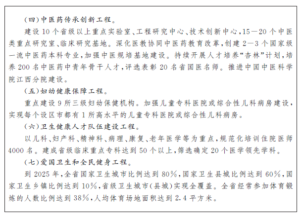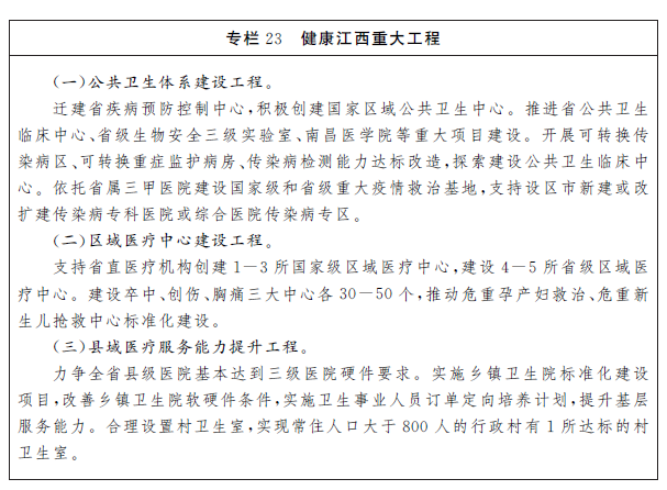 发挥中医药在治未病中的主导作用,做优做强中医优势专科,构建融预防保健、疾病治疗和康复于一体的中医药服务体系。积极创建国家中医医疗中心,完善基层中医药服务设施。推广应用以热敏灸为代表的中医康复治疗,规范发展中医养生保健机构。推动中医药传承创新发展,实施樟树“中国药都”振兴工程,支持“建昌帮”和“旴江医学”振兴发展。加强以赣产中药为主体的中药新药研发和二次开发,推动中药经典名方研究及产业化。进一步提升中药材种植和加工制造水平,加快建设全国道地药材检验检测中心。推进国家中医药健康旅游示范区创新发展。加强中西医结合,全面提升中西医疗服务质量。