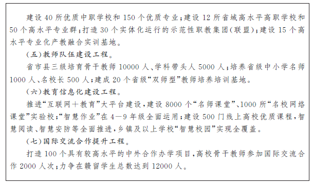 推进高等教育分类管理和高等学校综合改革,推动高等教育由数量规模型向内涵质量型转变,全面提升人才培养质量和科技创新能力。持续推进高等学校“双一流”建设,举全省之力办好南昌大学,争取进入世界一流大学建设高校行列。支持更多特色高校建设世界一流学科。优化高等教育布局,主动融入国家重大战略和全省发展需求,创建若干应用型本科院校,引导部分省属本科院校转型建设高水平应用型高校,加快培养理工农医类专业紧缺人才。深化高校省部共建体制机制,加大力度吸引国内外知名高校在江西开展合作办学,争取更多支持,丰富办学资源,扩大教育供给。稳步扩大研究生培养规模,深化研究生教育改革,提升高层次人才培养质量。扩大学校办学自主权,推进高校建立以章程为核心的制度体系。