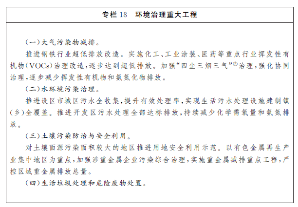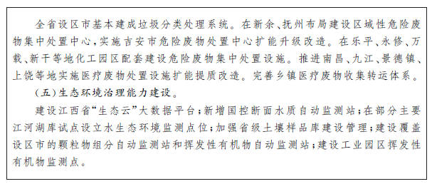 坚持精准治污、科学治污、依法治污,深入打好污染防治攻坚战,推动生态环境质量在较高水平上持续改善。着力打好蓝天保卫战,加强PM2.5和臭氧协同控制,推动多污染物协同控制和区域协同治理,全省空气质量总体达到二级标准。着力打好碧水保卫战,开展县级及以上城市集中饮用水水源地达标治理,推动生活污水处理设施覆盖全部建制镇(乡),因地制宜推进农村污水治理,国控断面水质实现“减四保三争二”减四保三争二:减少Ⅳ类水、保持Ⅲ类水、争取Ⅱ类水。。着力打好净土保卫战,开展国土空间全域土地综合整治试点,加强医疗废物和危险废物安全处置,加强塑料污染治理和塑料替代产品推广,持续推进化肥农药减量化,确保土壤环境质量安全稳定。深入实施长江经济带“共抓大保护”攻坚行动,深化“五河两岸一湖一江”全流域治理,推进生态环境污染治理“4+1”4+1工程:沿江城镇污水垃圾处理、化工污染治理、农业面源污染治理、船舶污染治理以及尾矿库污染治理。工程,强化沿线整治与岸线生态修复,努力构建长江经济带江西绿色生态廊道。加强光、噪音等新污染物治理。构建集污水、垃圾、固废、危废、医废处理处置设施和监测监管能力于一体的环境基础设施体系,推进环境基础设施网络向镇村延伸覆盖。探索建立符合产业发展实际的多层次节能环保装备标准体系,推动标准化生产、规模化应用,降低企业节能环保成本。