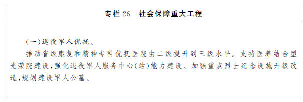 落实退役军人保障法律法规,全面推广实施“尊崇工作法”,健全退役军人事务管理工作机制和政策制度体系。深化退役军人安置制度改革,加大教育培训和就业创业扶持力度,拓展就业领域,提升就业安置质量。建立健全新型待遇保障体系,完善和落实优待政策,合理提高退役军人和其他优抚对象待遇标准,做好随调配偶子女工作安排、落户和教育等工作。完善伤病残退役军人移交安置、收治休养制度。加强退役军人保险制度衔接。构建“大双拥”工作格局,开展双拥模范城创建活动。大力弘扬英烈精神,加强烈士纪念设施建设和管护。