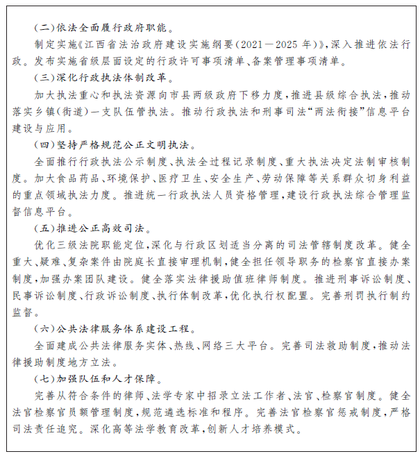 深入贯彻习近平法治思想,坚持依法治省、依法执政、依法行政共同推进,法治江西、法治政府、法治社会一体建设,健全完善党内法规,全面推进科学立法、严格执法、公正司法、全民守法。