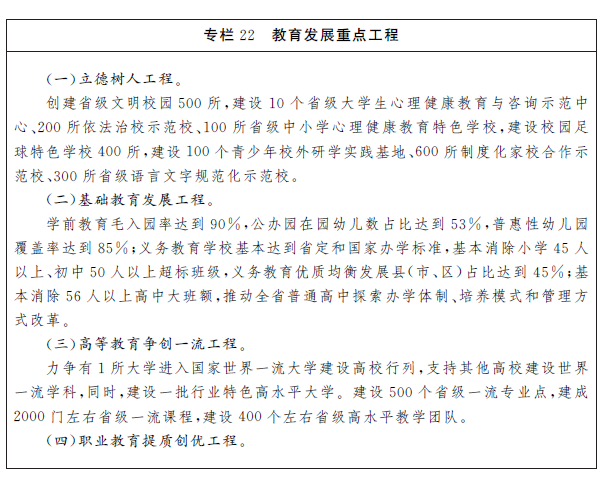 提升县域义务教育基本均衡水平,推进义务教育优质均衡发展,推进城乡学校在办学条件、教师队伍建设等方面全面达标,稳步推进义务教育城乡一体化。建立健全适应学龄人口变化的学校布局调整机制,加快城镇学校建设,增加学位供给,保障农业转移人口随迁子女平等享受基本公共教育服务。综合利用闲置校园校舍,加强乡村寄宿制学校建设。稳定乡村教师队伍,完善留守儿童关爱体系和义务教育控辍保学体系。加大高中阶段教育普及攻坚,鼓励高中阶段学校多样化、特色化发展,稳步推进高考综合改革。加强公办幼儿园建设,严格落实城镇小区配套园政策,构建建设管理长效机制,多渠道增加普惠性幼儿园供给,不断深化学前教育普及普惠安全优质发展。支持和规范民办教育发展,全面规范校外培训机构。办好特殊教育、民族教育和专门教育。