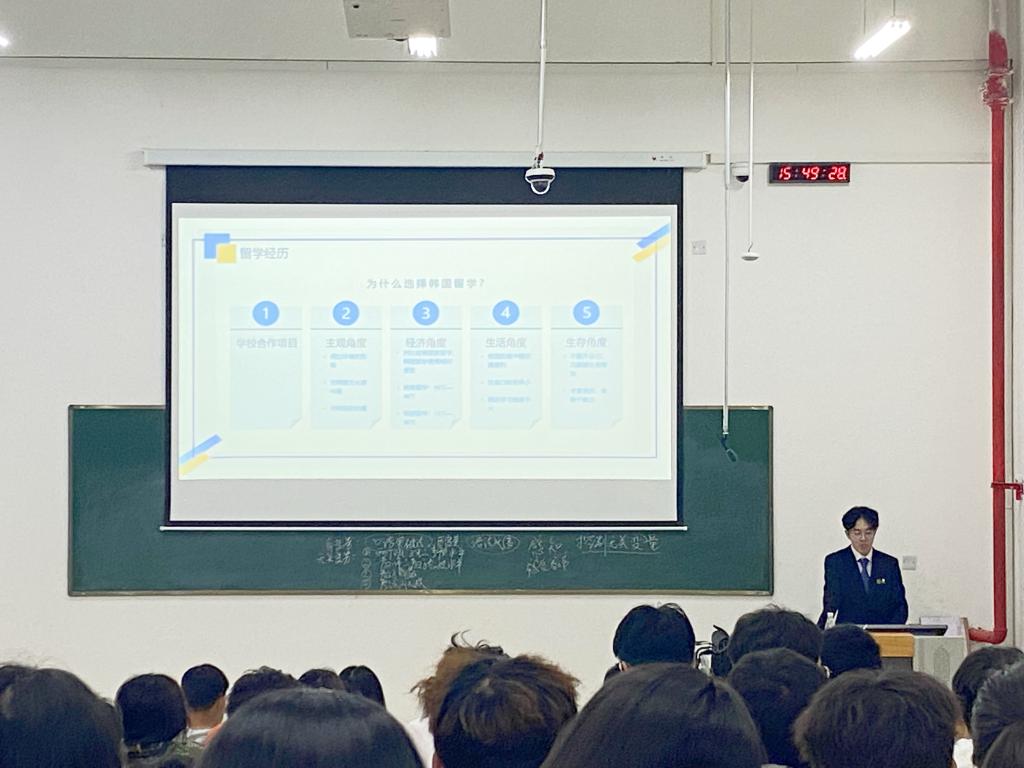 会上,王晨洋分享了赴韩国进行语言学习及学历提升的经历和心得体会,以及未来展望,他鼓励大家要自信面对生活与学习,为目标制定好学习计划,努力拼搏。