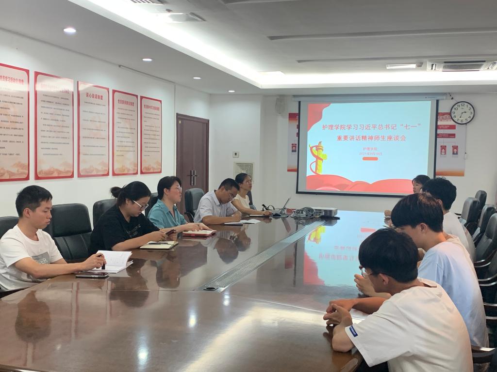 9月18日下午,护理学院在科技综合楼413会议室召开了学习习近平总书记“七一”重要讲话精神师生座谈会。会议由护理学院党总支副书记张蔺珊主持,护理学院党总支成员、学生党支部的老师和各班学生代表参加了座谈会。