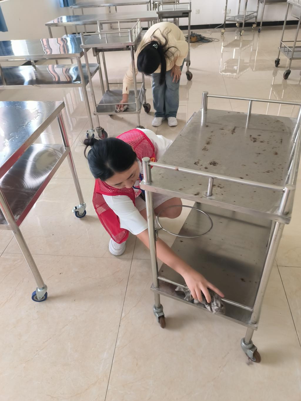 活动中,全体师生分工明确,各司其职:有人负责扫地;有人擦桌子;有人整理物品。他们认真细致地完成每一项任务,一丝不苟地清理着每一件物品打扫每一个角落。在大家的团结协作下,经过一个暑期、早已灰蒙蒙的实训室,变得干净整洁。学生们用自己的行动诠释劳动的重要性和价值,体验到劳动的乐趣,体现团队合作的精神。