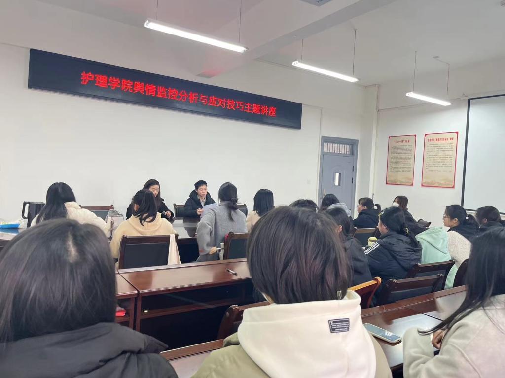 为使大学生增强舆情分析意识,掌握应对舆情技巧,营造安全、和谐、稳定的校园环境,3月11日下午,护理学院在和济楼C218召开舆情监控分析与应对技巧培训会,辅导员刘明健、宗卢帆担任主讲,各班班长、舆情信息员参加培训。