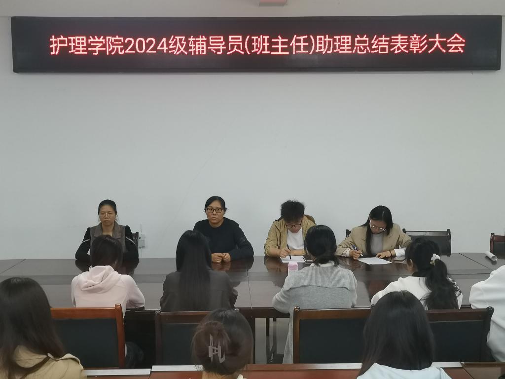 为提升学生管理工作水平,总结经验,表彰先进,11月15日,护理学院在和济楼C218召开2024级辅导员(班主任)助理总结表彰大会。院党总支副书记曲晴、团总支书记刘小三、学工科长胡祖昌、辅导员潘红林及2024级全体辅导员(班主任)助理参加会议。