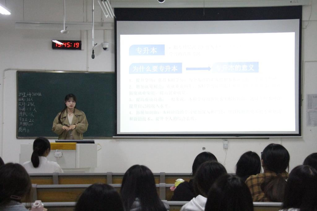 学长学姐们分组走进各个班级,将自己备考专升本的故事娓娓道来,详细阐述专升本是什么、备考科目有哪些,倾囊相授科学备考秘籍和应对难题的锦囊妙计。此外,他们还带来了许多备考“宝藏”:实用的学习网站、干货满满的公众号、助力学习的工具以及不可或缺的书籍,为同学们打开了一扇全面了解专升本的大门。不仅如此,学长学姐们还叮嘱同学们要紧盯官方报名和考试信息,注意关键时间节点。他们还强调要明确学习的意义,合理规划时间,以积极乐观的心态迎接学习挑战,远离精神内耗的漩涡。