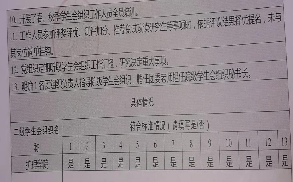 13. 明确1名团组织负责人指导院级学生会组织;聘任团委老师担任院级学生会组织秘书长。 |