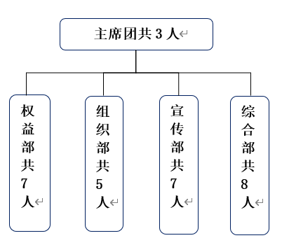院学生会工作人员不超过30人,主席团成员不超过3人,工作部门精简至四个部门(综合部、宣传部、组织部、权益部)。除学生会主席团成员和工作部门成员,均不设置其他任何职务。学生会组织确需主办的重大工作或活动,可根据需要以项目化方式招募志愿者,吸收同学参加,因事用人,事完人散。