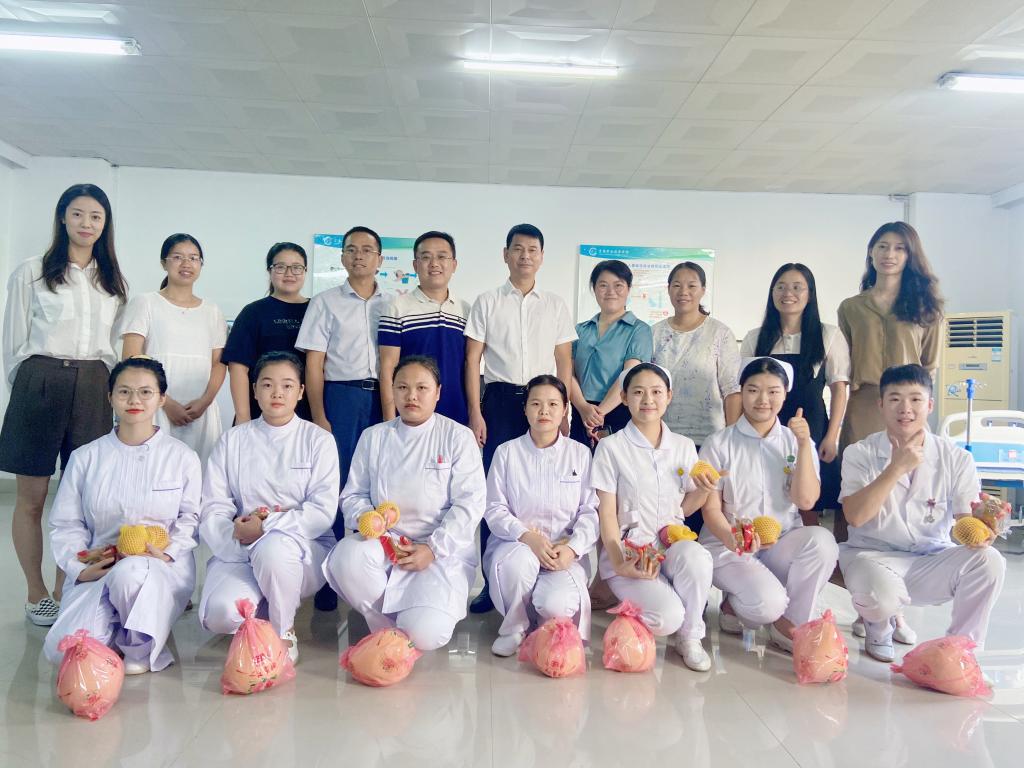 9月18日下午,在中秋佳节来临之际,护理学院院长熊杰平率领院领导班子来到实训大楼慰问参加江西省技能竞赛集训的选手们与指导老师们,向参加集训的师生致以节日的祝福,为省赛选手们送上月饼等慰问品。