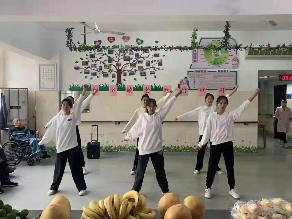 重阳节前,护理学院精心组织志愿者队伍,选歌曲、排舞蹈、做节目、备音响和配服装等做好系列准备工作。重阳节当天,志愿者们为养老护理院老人们带来了唱歌、舞蹈等精彩的节目,赢得了老人们的笑声、掌声和赞美声。志愿者们还深入老人房间,全面了解老人们生活护理情况,为失能的老人拖地、整理房间和打扫卫生,还为老人们讲解了一些常用的护理技能,为老人们做了实事做了好事。老人们十分开心!