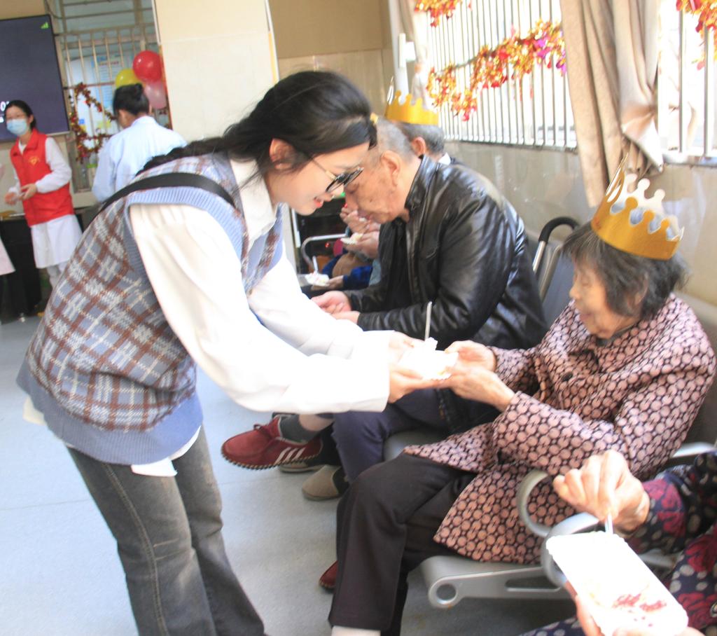 活动现场,同学们热情细致地为老人健康义诊,帮助老人测量血压,讲解“三高”、糖尿病、心脏病、心脑血管等各类问题,从日常饮食,预防与干预老年常见疾病等方面普及健康保健知识。同学们精心准备《强军战歌》《太阳》等节目为老人送上浓浓的节日祝福,老人们看得津津有味,现场掌声、喝彩声此起彼伏。表演结束后,同学们与长者互诉家常,并为老人们过生日,老人们吃着蛋糕,唱着生日歌,个个喜笑颜开,现场气氛温馨祥和。
