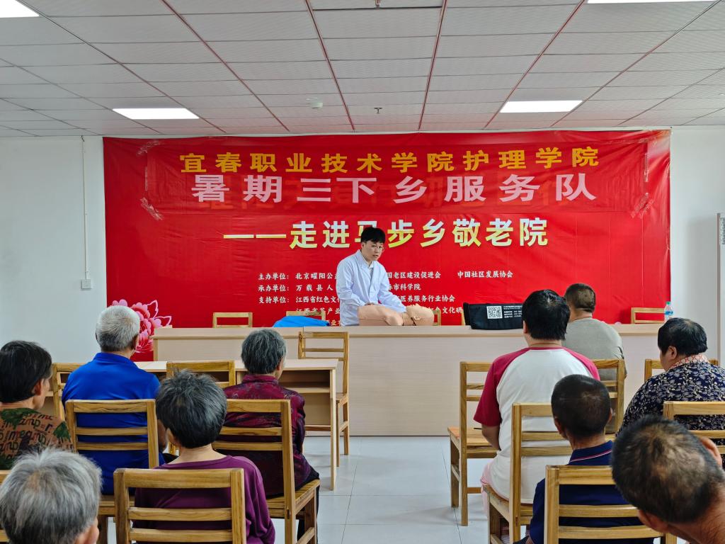 在万载县马步乡养老院,实践队的师生们与老年人亲切交谈,了解他们的生活起居和身体状况,为老年人健康体检,测量血压与血糖。同时,队员们细心陪伴老人,带领老人们练习手指操,帮助老人活动筋骨、增强体质。