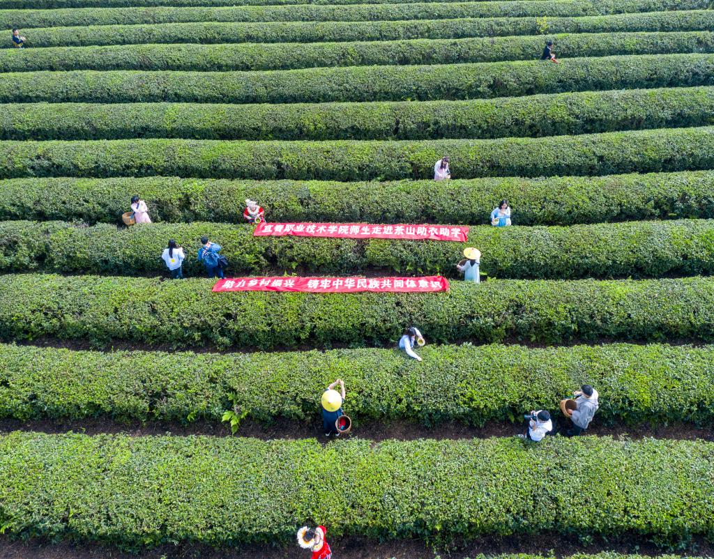 全体师生在茶农的带领下走进茶园助农采茶,他们一边聆听茶农讲述茶叶采摘知识,一边现场采摘。