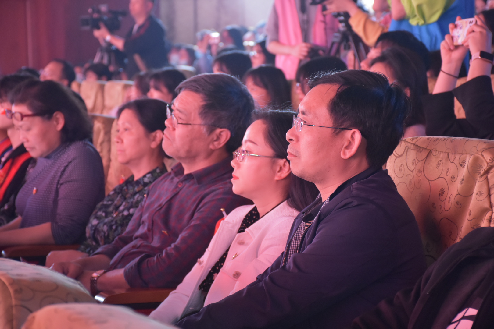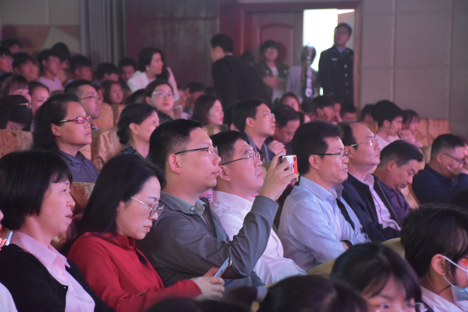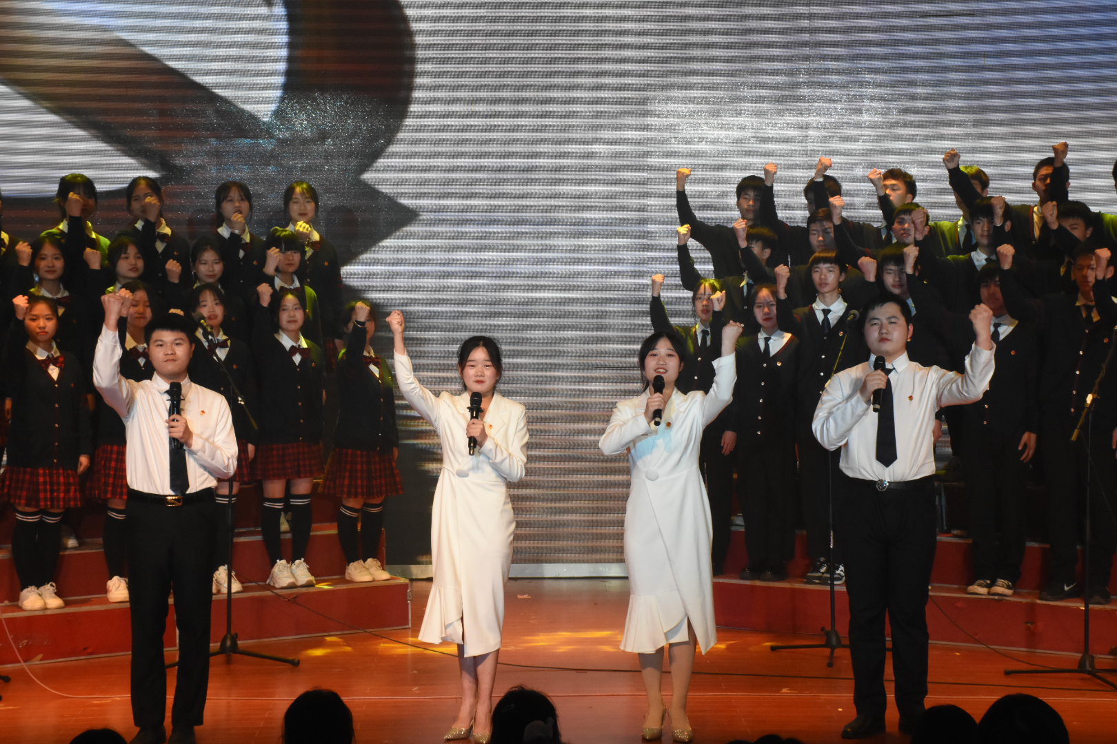 纪念“五四”运动102周年文艺汇演正式开始,开场舞《奔跑的青春》率先点燃全场氛围,少女们用青春炫丽的舞姿、阳光灿烂的笑容向大家展示了活力四射、元气满满的青年一代。大合唱《四渡赤水出奇兵》将大家的思绪带回那战火弥漫的年代,展现了红军战士英勇无畏、不屈不挠的英雄气概。“阿洛……阿洛……”一声声迫切的呼喊牵动着现场观众的心弦,情景剧《我要找到你》讲述了一名彝族学生阿洛依子走失、师生们自发参与营救并成功将阿洛寻回的感人故事。伴随着轻快的民族乐律,藏族舞蹈《天域》的表演者们素手婉转流连,裙裾飘飞旋转,灵动飘逸的舞蹈展示了各族人民团结奋斗的事迹。朗诵《永远的太阳》铿锵激昂、热血澎湃,为大家展示了永远绽放光芒的中国共产党及同学们对党百年艰苦奋斗的赞扬与感激。一条条跃动的红色长扇演绎了红色神韵,舞蹈《红色摇篮》描绘了当代热血青年致敬革命先辈、传承红色经典的心路历程。合唱《强国一代有我在》以动情的歌声唱出了青年学子对新时代的信心与期望,勉励青年与时代同步伐、与祖国同命运。情景剧《我和我的家乡》讲述了新时代大学生直播带货、齐心助力乡村振兴迈向新发展格局的先进事迹。舞蹈《碇步桥水清悠悠》表现了在战火纷飞的年代,家属们等待革命战士凯旋的心情。大合唱《唱支山歌给党听》婉转动人,表演者们身着民族服饰,用嘹亮的歌声诠释心中对党的无限热爱和深切祝福。快闪《没有共产党就没有新中国》将现场气氛推向了高潮,全场观众起立挥舞手中的红色国旗、党旗、团旗,高声齐唱,文艺汇演至此落下帷幕。
