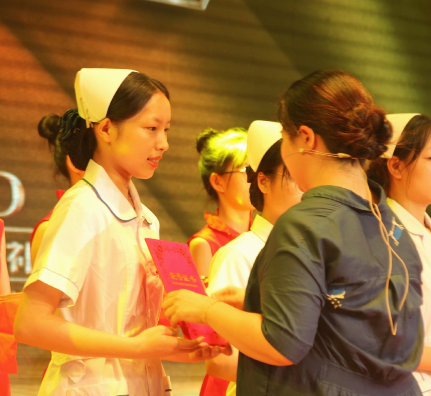 一顶燕帽、一身白衣、一束烛光、一段誓词,是使命和专业精神的传承。护生们身着圣洁的白衣,面带微笑、步态优雅,恭敬地来到护士前辈面前,缓缓下蹲,虔诚谦虚地承接前辈授帽。何新华老师带领全体护生庄严宣誓:要谨记南丁格尔无私奉献的精神,践行救死扶伤的使命,更积极地投入到医疗卫生事业建设发展中!