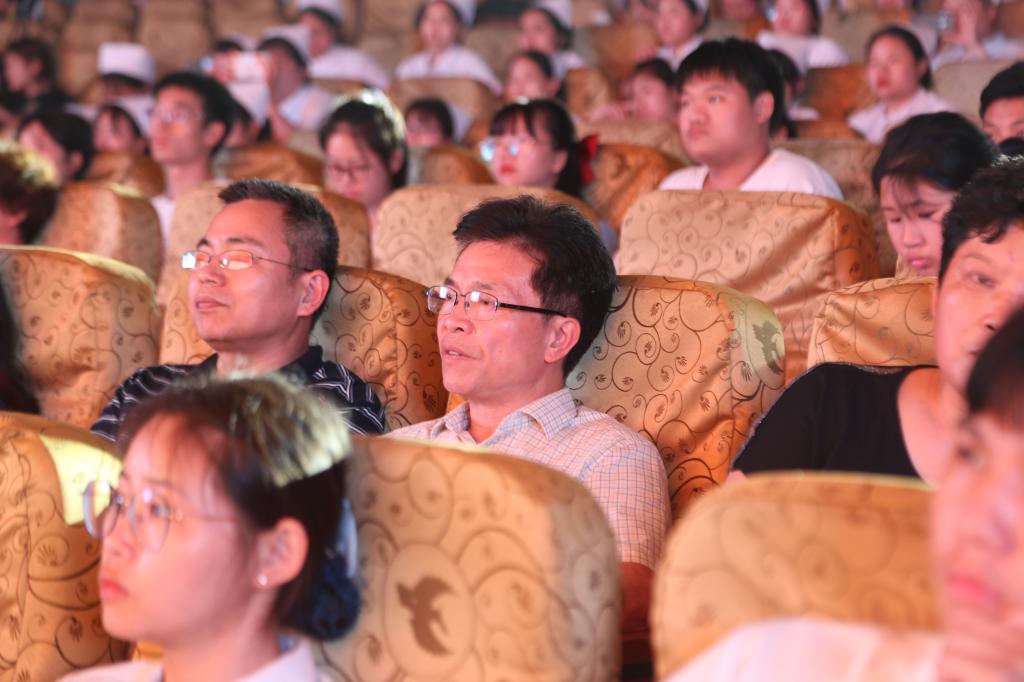 校党委副书记、校长杨云山,校党委委员、副校长张印华,学工处处长谢海英,团委书记施旸,师范学院党总支书记邹晓英,护理学院班子成员、全体教师、班主任(辅导员)和六百余名学生共同观看演出。