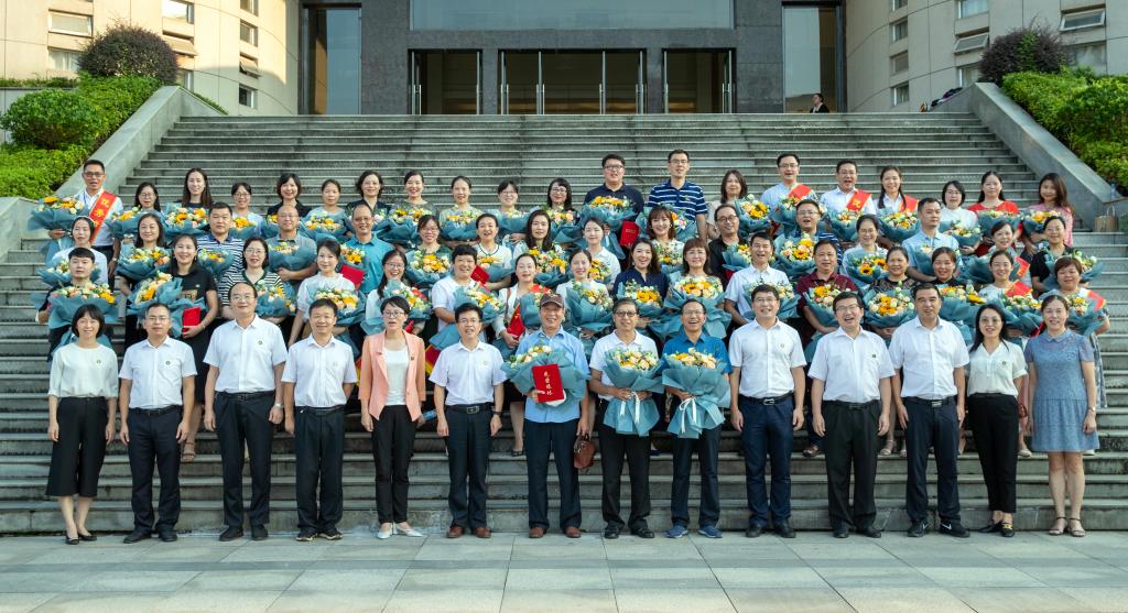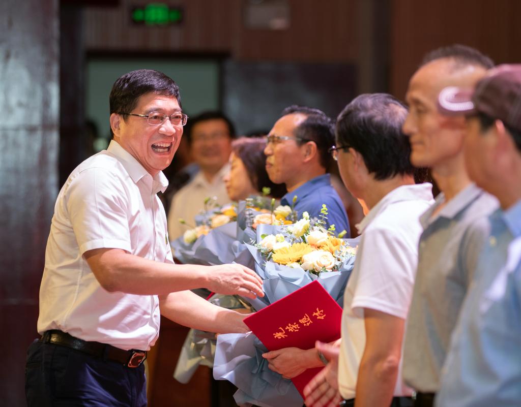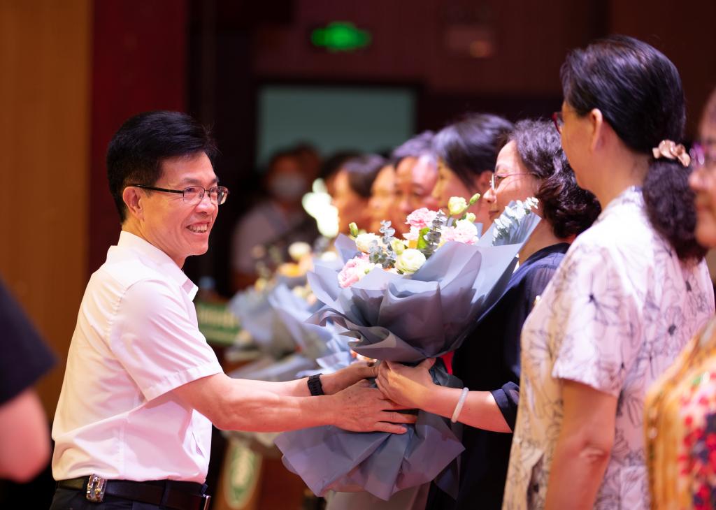 大会伊始,全场起立,奏唱国歌。党委副书记、校长杨云山宣读《关于表彰2021年“师德标兵”的决定》《关于表彰第七届优秀辅导员(班主任)的决定》《关于表彰教学名师、骨干教师、教坛新秀的决定》。在生动热烈、庄重而温馨的气氛中,校领导为3位“师德标兵”、2名教学名师、23位骨干教师、10名教坛新秀、10位优秀辅导员(班主任)、9名从教三十年教师及7位光荣退休职工颁发证书并献上鲜花。