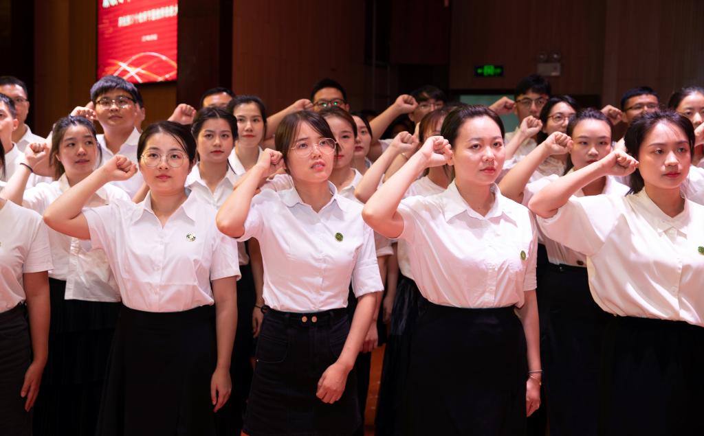 “我志愿成为一名人民教师,忠诚党的教育事业……”新入职教师们举起右拳、目光坚定,在“师德标兵”刘海云老师的领誓下进行入职宣誓。铮铮誓言、铿锵有力,新教师们心中油然而生一种强烈的荣誉感、自豪感、责任感和使命感,立志成为新时代“四有”好老师、争做高等职业教育的排头兵。