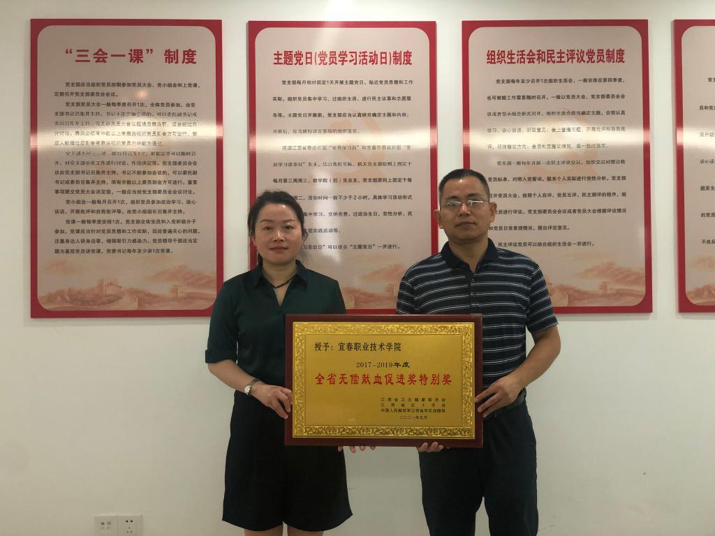 本站讯(校团委 梅应轩),9月7日上午,宜春市中心血站站长袁小玲,宣策科科长周军等一行三人赴英国上市公司365颁发“2017-2019年度全省无偿献血促进奖特别奖”奖牌,校党委委员、副校长张印华,校团委全体工作人员参与此次授予仪式。