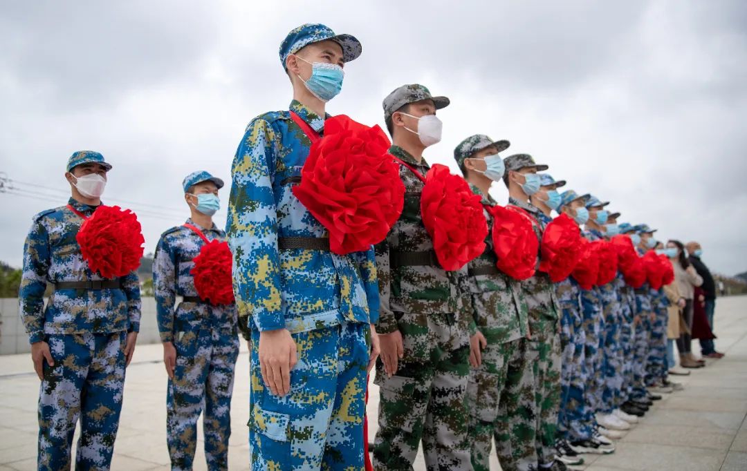 欢送仪式上,20名即将入伍的新兵排着整齐的队伍、踏着整齐的步伐整装待发。他们经过前期报名、体格检查、政治考核、量化考察以及集中封闭的役前训练,已经做好奔赴军营的准备。