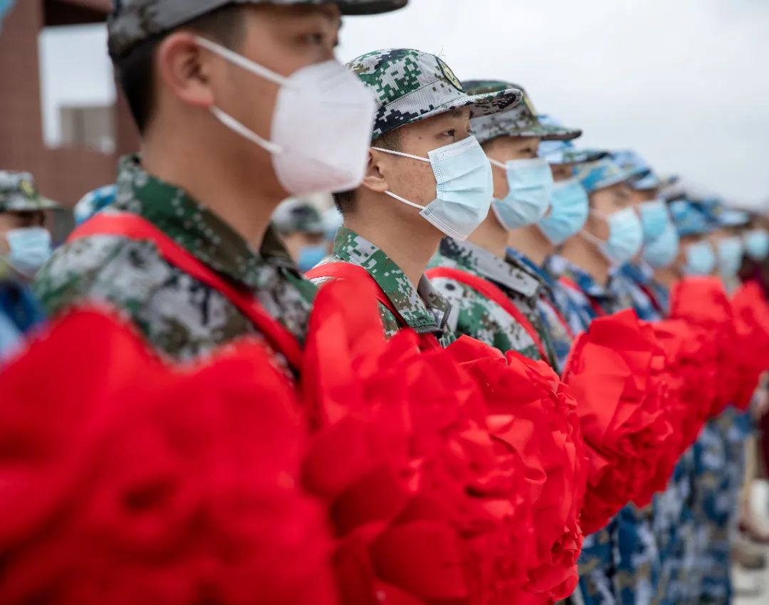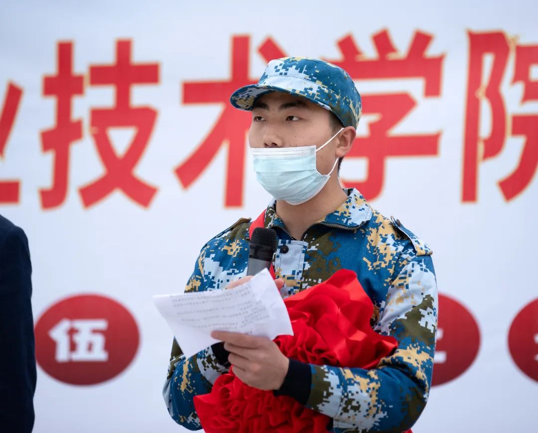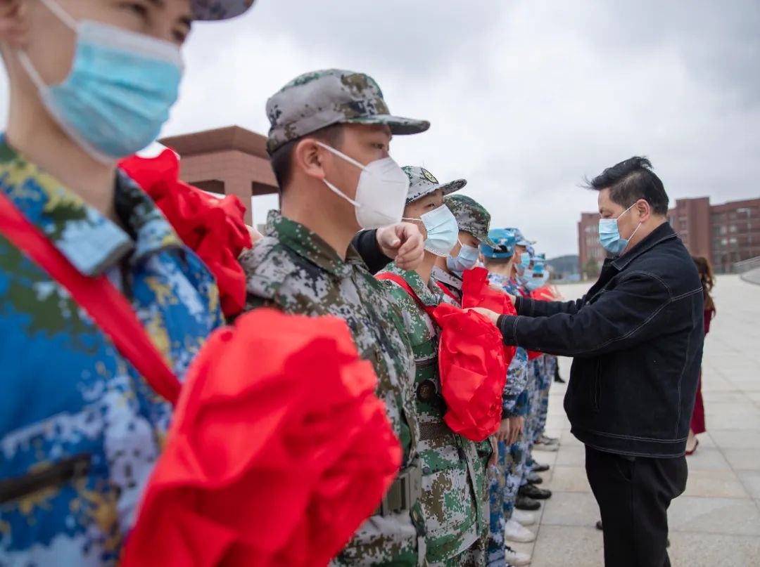 随后,参加仪式的领导、老师为全体新兵佩戴了大红花。新兵代表、医学院19级大药1班的邹新浩同学作了发言。