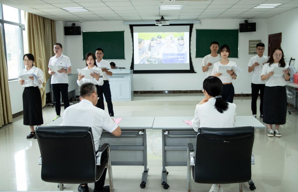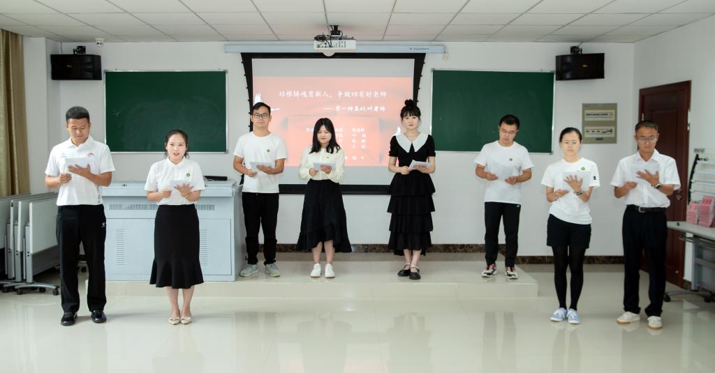 9月3日下午,岗前培训结业仪式如期举行。新教师围绕朗诵主题“培根铸魂育新人,争做‘四有’好老师”,分组进行朗诵展演。从《毛泽东写给老师徐特立先生的祝寿信》《培根铸魂,筑梦强基——我们都是追梦人》《有一种美好,叫老师》再到《甘为人师,无悔青春》,新教师用激情澎湃、真挚动人的声音在告诉大家:作为一名教师,我们要坚守爱生如子的信念,尽情地发光发热。一句句声情并茂的朗诵,如微风拂水时激荡的涟漪,悠长隽永;一声声抑扬顿挫的吟咏,如初夏枝头跌宕起伏的雨串,婉转动听。