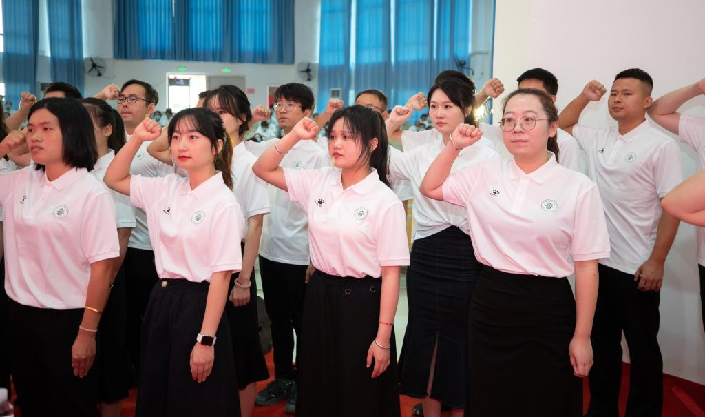 “我志愿成为一名人民教师,忠诚党的教育事业……”新入职教师们身着印有学校校徽的白T恤,在邱军监誓、人事处处长熊淑萍领誓下进行入职宣誓。宣誓后开展“拜师”仪式,校领导为“师父们”颁发聘书,“徒弟”向“师父们”献花并鞠躬作揖行拜师礼。