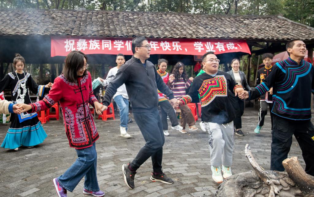 在现场,鲜红的五星红旗高高飘扬,节日祝福标语高挂屋檐。灶台旁,同学们热火朝天,干劲十足,七个柴火灶热气腾腾,地道的彝族美食坨坨肉香气四溢。广场上,优美的旋律响起,学生们和老师们手拉手,肩并着肩,围着篝火跳起彝族传统舞蹈达体舞,大家跺着脚拍着手,欢呼声和欢笑声交织在一起,喜庆、温馨、愉快的节日氛围弥漫开来。