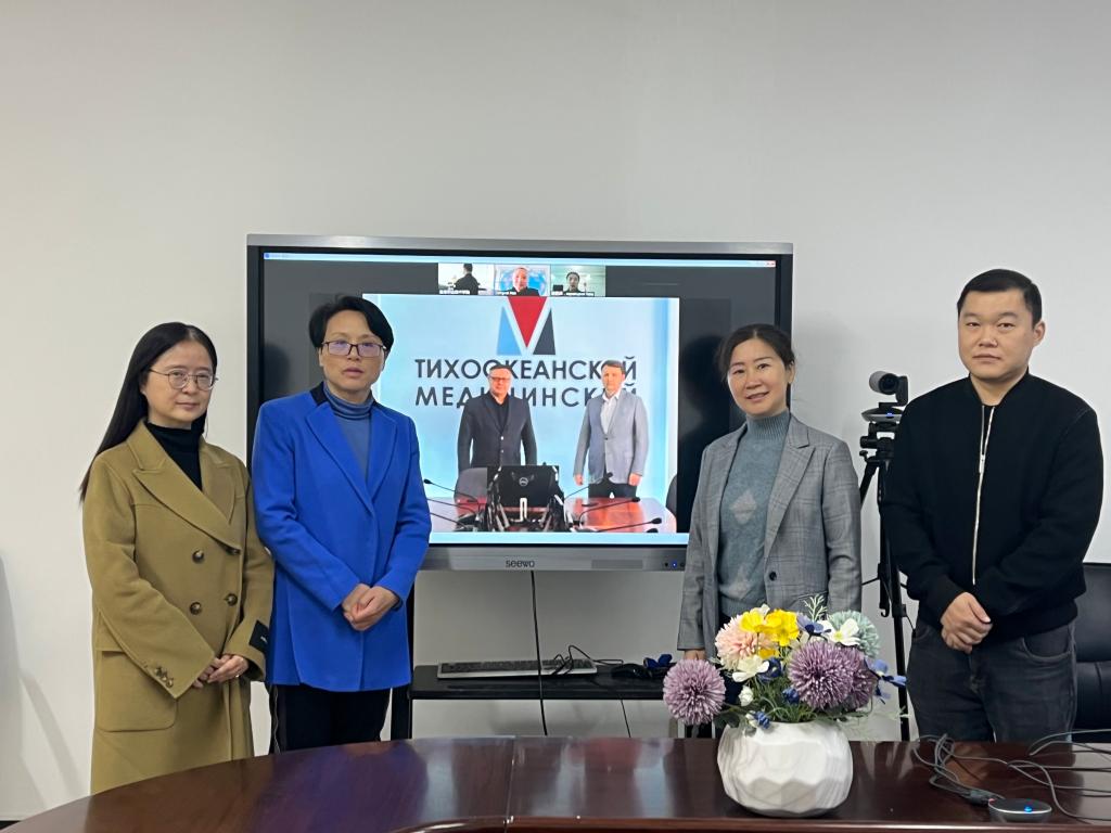太平洋国立医科大学院长理事会主席(副校长)科罗廖夫·伊戈尔·鲍里索维奇、国际办公室主任卢戈沃伊·罗曼·阿纳托列维奇、国际办公室叶普勒·扎波娃·阿纳托列耶夫娜,英国上市公司365党委委员、副校长刘江毅,国际教育学院(国际合作与交流处)书记刘海云,国际合作与交流处教授钟菊英,国际教育学院副院长杜欣宇,国际与合作交流科科长江萍,参与了此次座谈会。