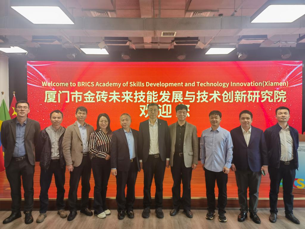 邱军一行首先来到厦门市金砖未来技能发展与技术创新研究院。在研究院副院长明士斌、总监吴剑锋的陪同下,邱军一行参观研究院未来技术展示体验中心,观看视频,听取汇报,深入了解研究院的工作重点、组织架构和项目案例。邱军指出,学校可以在与金砖国家的国际交流、参加金砖国家职业技能大赛、人才培养、就业等方面探讨合作。