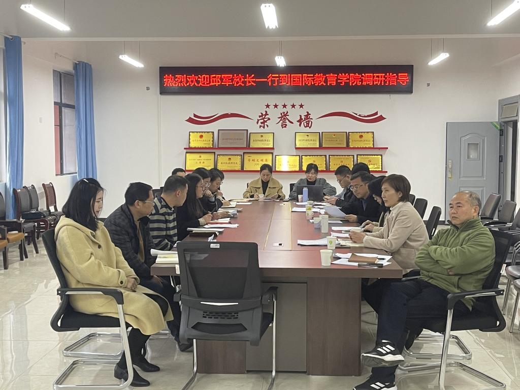 邱军认真听取了国际教育学院的汇报,对学院提出的问题与困惑进行了切中要点的分析和指导,并强调,学院要落实四点工作要求,即:明目标,知短板,突重点,强落地。一是明目标。要转变理念,加强与其他各专业之间的融合,利用专业特色优势,为其提供支撑国际化发展的力量;同时,重点专业小学英语教育专业要提质量,做精做强;新专业应用英语专业要及时融入专业群,共同发力推进专业的快速做大做强。二是知短板。根据专业发展的需求,前瞻性做好双师型教师队伍的建设;同时要尽快对接头部企业,使得校企合作落地落实。三是突出重点。一方面要持续强化国际交流工作,助力英国上市公司365“双高”建设;另一方面则要积极对接商务部门,了解全市外贸企业用人需求,应用英语专业真正做到“产教融合”,并且要着力利用现有基础打造名师工作室,发挥领军人物的影响力。四是要强落地。鼓励引导老师们要在工作中不断学习和提升;要将工作内容清单化,有序完成各项指标;同时,强化沟通,团结力量,与其他部门、院系共同思考解决问题方法,不断提升工作效率。