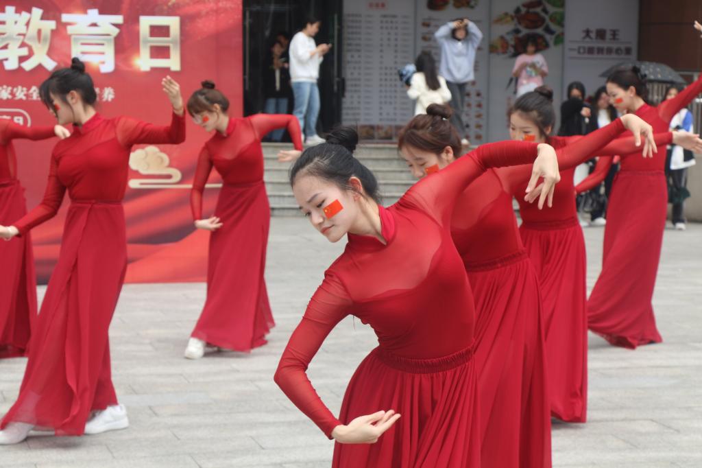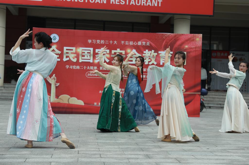 动感音乐声响起,手势舞《守护国家秘密·维护国家安全》迅速吸引来往师生驻足观看。整齐的队形和优美灵活的手指动作化成语言,传达青年守护国家安全的决心。热烈的欢呼声中,《唱支山歌给党听》《映山红》演唱者激情开嗓,明朗激昂的旋律霎时席卷活动现场。《丽人行》唯美的舞蹈及浓郁的中国风,尽显祖国文化底蕴,爵士舞《擦玻璃》和《oh》刚柔并济的舞姿跳出青春魅力。《一起向未来》活力四射的表演瞬间点燃全场,在场师生难掩内心激动,纷纷加入的大合唱,歌声回荡在校园,诉说着每一个宜职学子的爱国情怀。