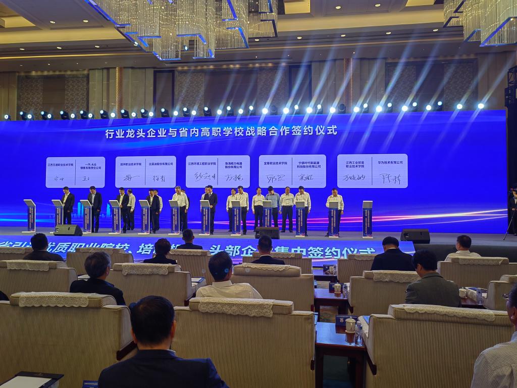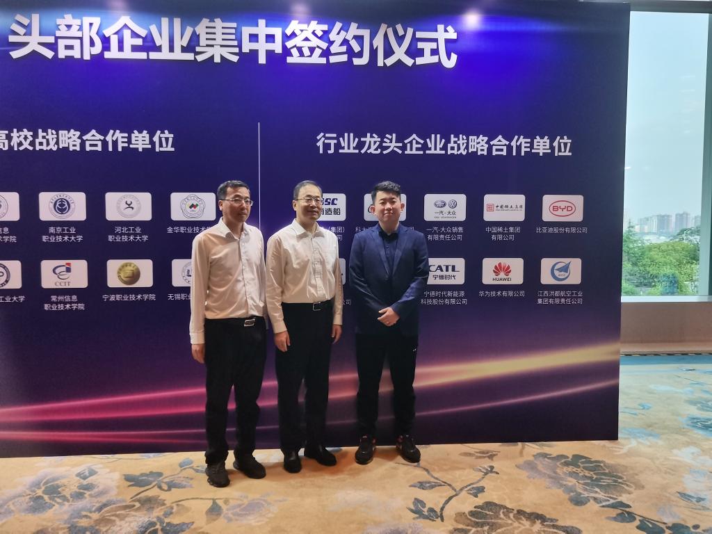 签约仪式上,邱军代表学校与10所行业龙头企业中的宁德时代新能源科技股份有限公司签订校企共建“数字锂电产业学院”合作协议。通过创新人才培养模式,重构课程体系,订单式培养人才,共建新能源材料应用技术、机电一体化等专业,共建共享专兼结合的双师型教师队伍,探索产业学院运行新机制,提升学校职业教育与产业发展的适配度和融合性,助推学校“双高计划”建设,为培养服务宜春锂电新能源产业高质量发展的“赣鄱工匠”和“能工巧匠”贡献更多宜职力量。