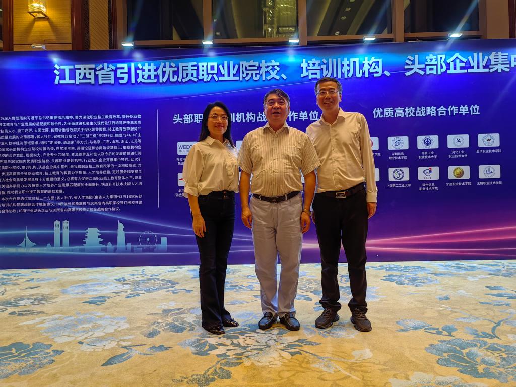 本站讯(赵琰)携手打造技能人才高地,奋力推进职业技工教育高质量发展。4月21日,江西省引进优质职业院校、培训机构、头部企业集中签约仪式在南昌举行。省委常委梁桂出席仪式并见证签约,副省长孙洪山主持。校党委副书记、校长邱军,党委委员、副校长易滨秀一同参加签约仪式。签约仪式前,校长邱军分别与孙洪山副省长和教育部职成司二级巡视员刘杰进行了交流,省领导对学校取得的成绩表示肯定和赞扬。