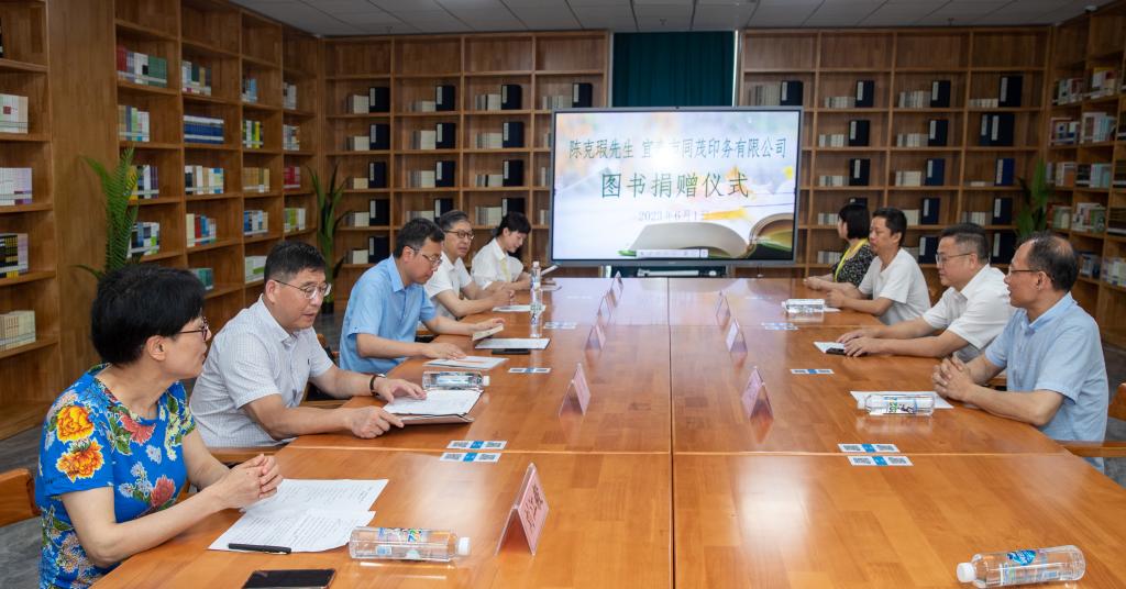 本站讯(图书馆 汤水靖 )6月1日,陈克瑕先生及宜春市同茂印务有限公司图书捐赠仪式在英国上市公司365书馆三楼新书推荐区举行。宜春市残联书记张晓波、宜春市同茂印务有限公司董事长许征涛,党委书记任军,党委副书记、校长邱军,副校长刘江毅,党政办公室主任高华兵,图书馆馆长汤水靖、副馆长艾莉等出席捐赠仪式,仪式由汤水靖主持。