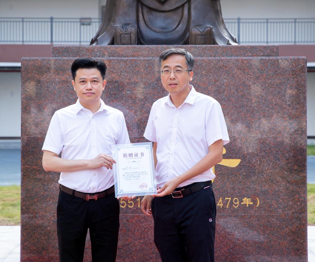 李晖、邱军共同为孔子像揭幕,邱军为李晖颁发捐赠证书。