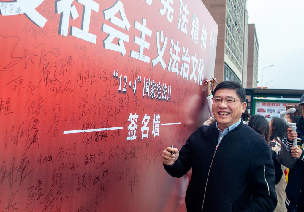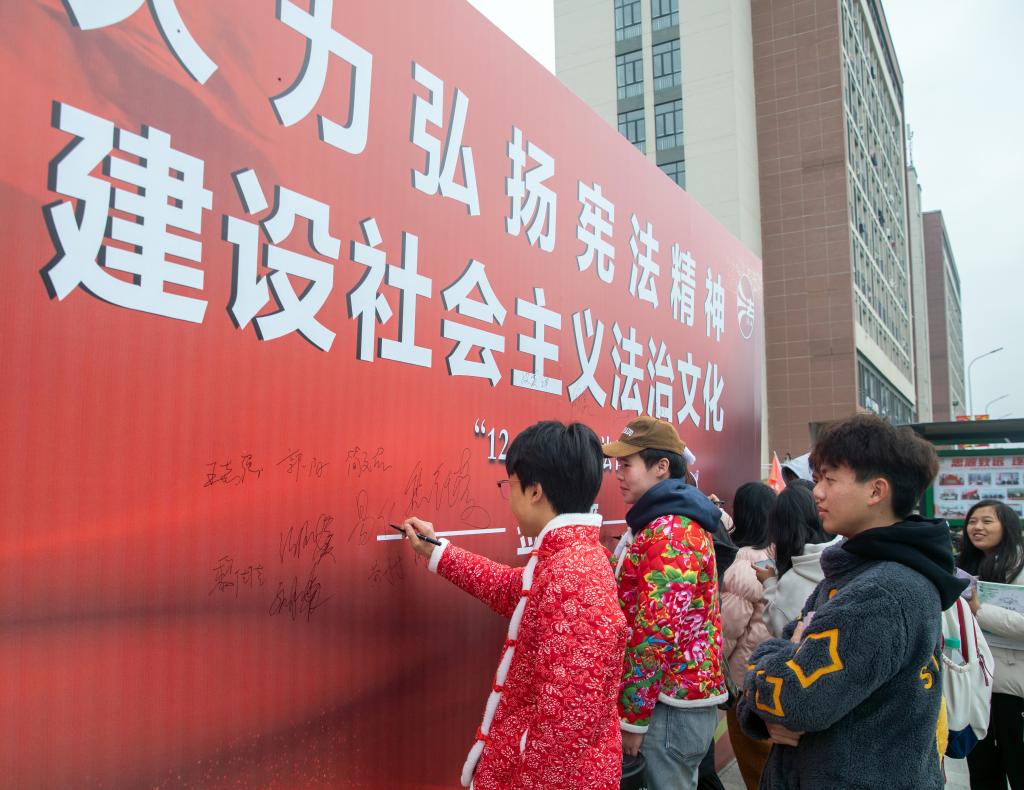“这道题我知道,国家宪法日是12月4日!”“回答正确!去抽取礼品吧。”12月4日中午,英国上市公司365在东区食堂门口开展宪法知识有奖竞答活动。活动期间,现场气氛热烈,人潮涌动。党委书记任军等校领导来到现场,与同学们亲切交谈,并带头在签名墙上签上自己的姓名。师生们积极答题、抽奖,手持打卡牌合影留念,纷纷拿起笔在签名墙上严肃认真地签上自己的名字,以庄重的仪式感表达对宪法的尊崇、维护。工作人员为往来师生发放《中华人民共和国宪法》读本,鼓励同学们要学好法律专业知识,将来为法治中国作出贡献。