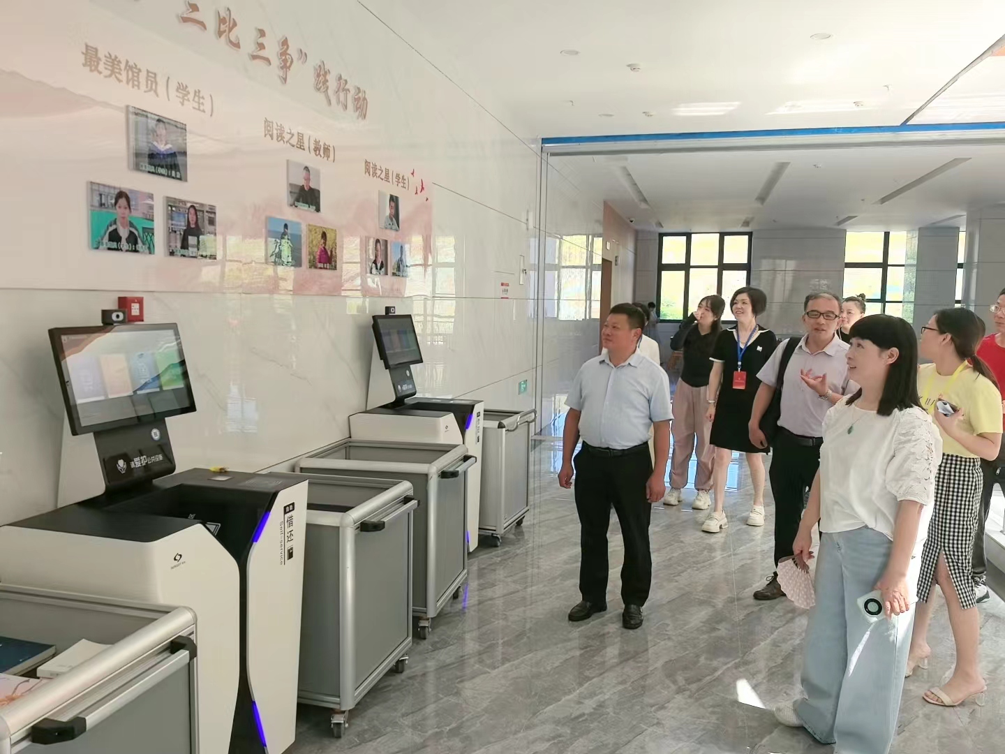 大家参观了图书馆的有声书屋、多功能厅、学生阅览室、教室阅览室、少儿阅览室、VR体验区、墨水屏阅览室、四楼新书库等,体验了智能钢琴、VR头盔、图书瀑布流、音乐瀑布流等智能化设备。