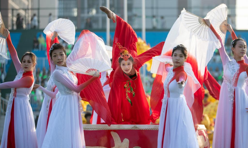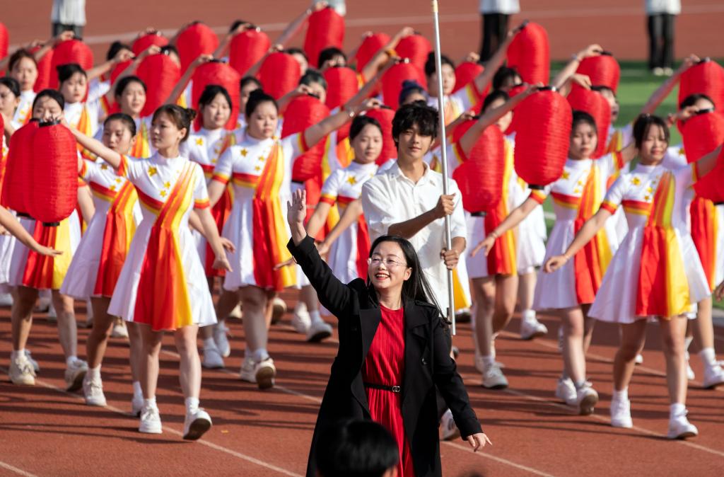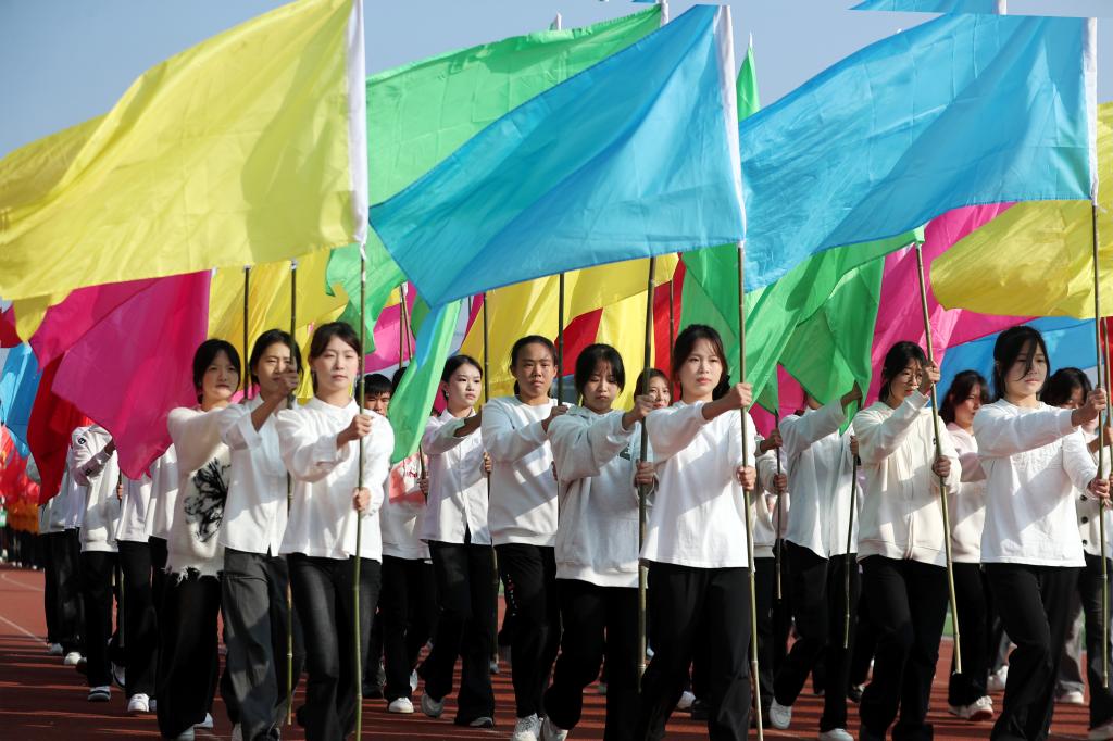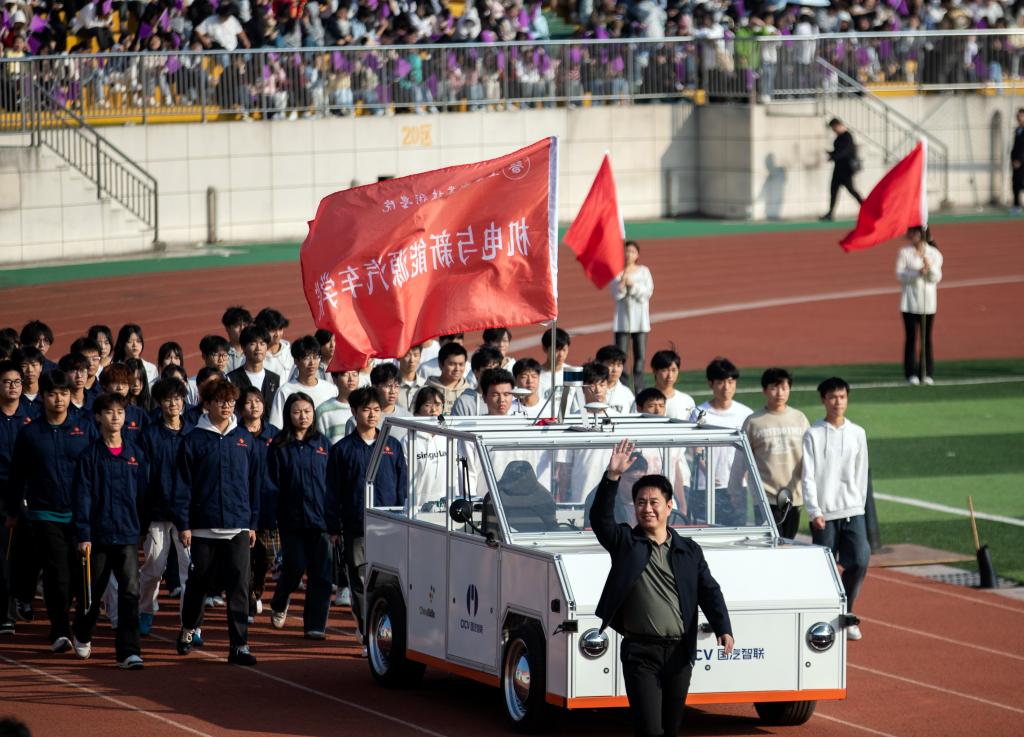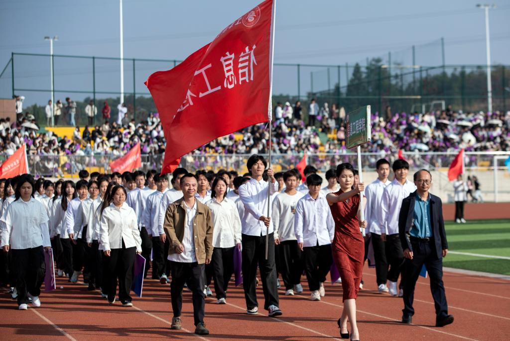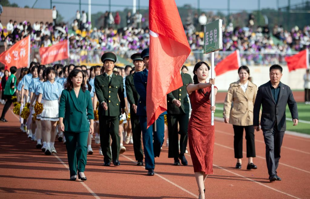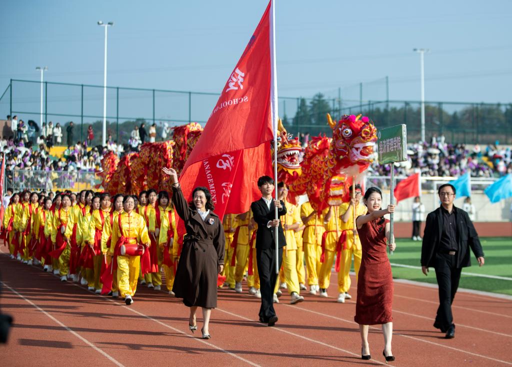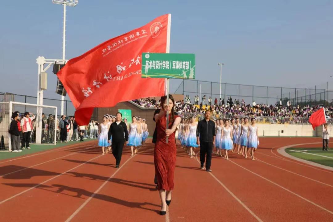 紧随其后的是各学院方阵。护理学院代表队身着流光溢彩的衣裳,手舞红橙黄三色绸扇随风蹁跹,红绸带在空中交织勾绘,化作闪耀夺目的五角星;医学院代表队由身着戎装的退伍军人担当旗手,表演者手持黄色花球,脚踏动感节拍,活力满满;师范学院代表队的灯笼舞喜庆十足,灯笼在表演者手中时而高举,时而低垂,变幻出一幅幅流动的红画卷;机电与新能源汽车学院代表队以无人机领航出场,紧随其后的无人驾驶汽车,诠释着“科技强国”的深刻内涵;经济管理学院代表队舞起巨龙,打起腰鼓,热闹非凡;信息工程学院代表队以键盘造型创意出场,在键盘起伏中,“数字出彩、惟信惟工”八字逐一显现,奏响数字时代最强音;艺术与设计学院代表队宛若高贵的白天鹅,翩翩起舞,纤纤玉手,灵动飘逸,带给观众一场如梦如幻的视觉享受。