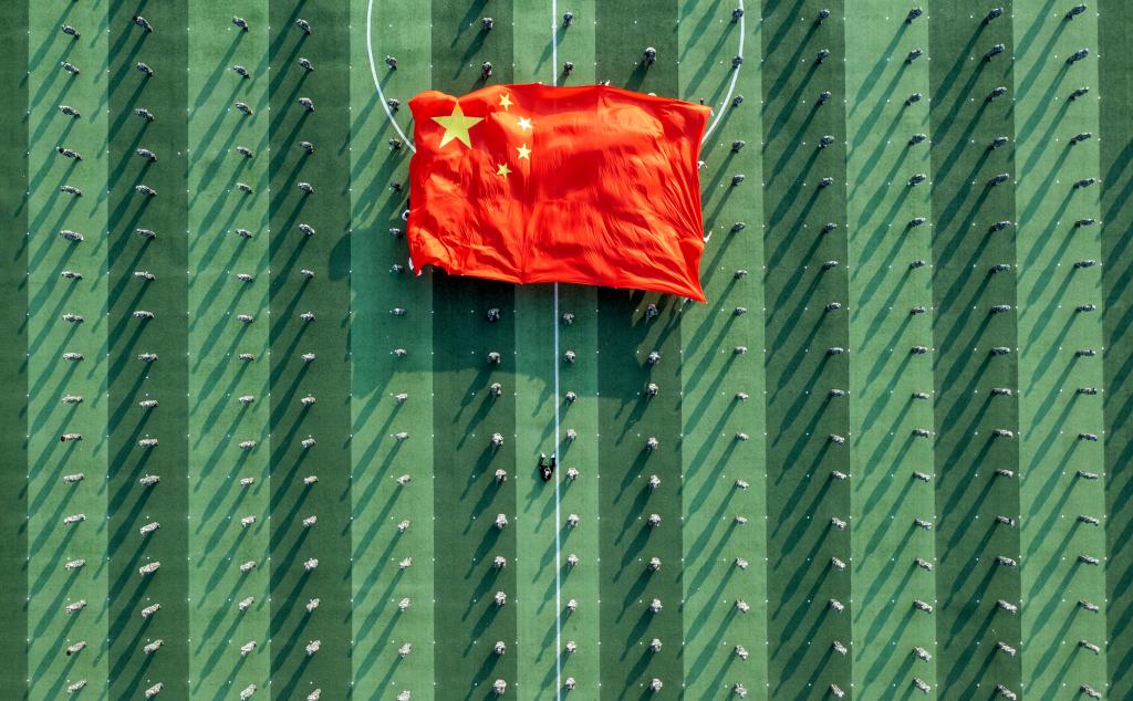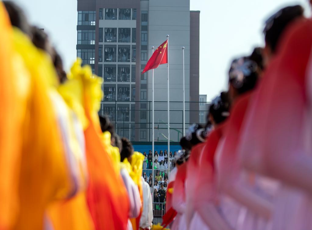 在激昂嘹亮的国歌声中,鲜艳的五星红旗冉冉升起,全体师生面向国旗,肃立致礼,齐唱国歌。