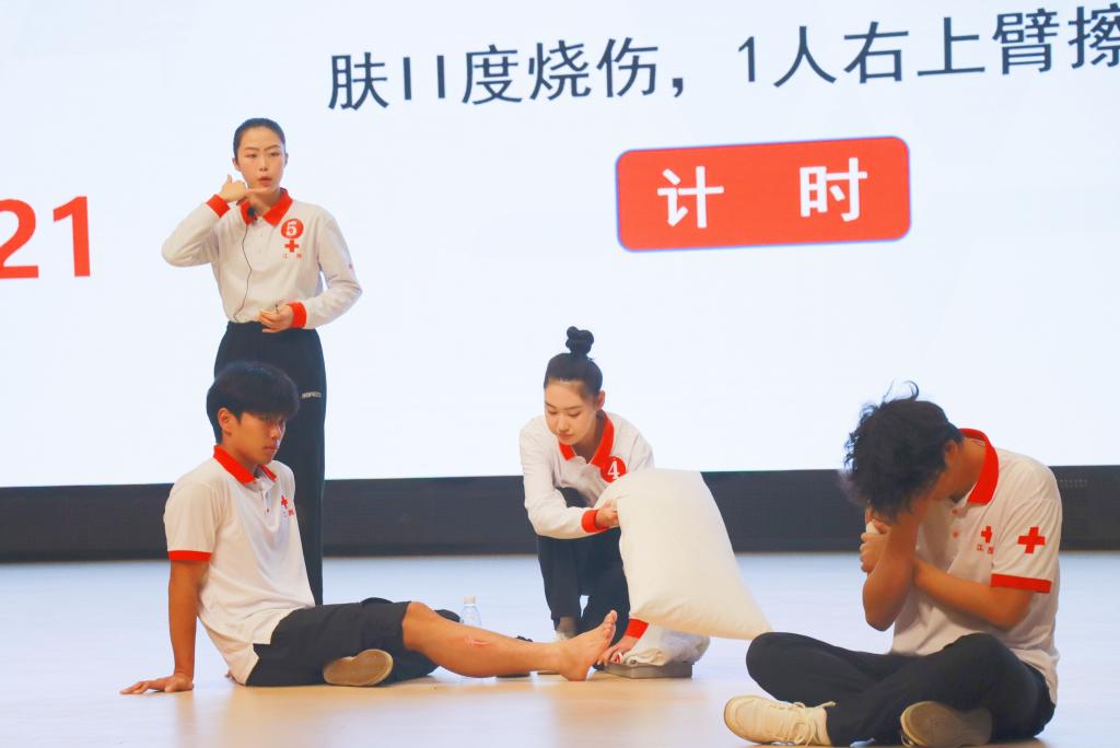 2024年,学校按照第二批全国急救教育试点学校工作指南和要求,持续推进急救教育试点校相关工作。今年校内新增自动体外除颤器(AED)3台,进一步更新完善了应急设施设备;选送5名年轻教师参与江西省应急救护师资培训并获得资格证,壮大了应急救护师资队伍;首次将应急救护教育融入新生军训中,为全体新生进行急救知识和实践技能操作培训,新生急救教育普及率达到100%;开办救护员培训班28期,培训合格持证红十字初级救护员1500余人;依托学生社团成立应急救护先锋队,定期开展“地摊急救”教学;成功举办应急救护技能大赛,共有12支队伍参加比赛;党建带团建,定期组织党员、入党积极分子前往社区开展志愿服务活动,为社区工作人员和居民宣传应急救护教育知识。