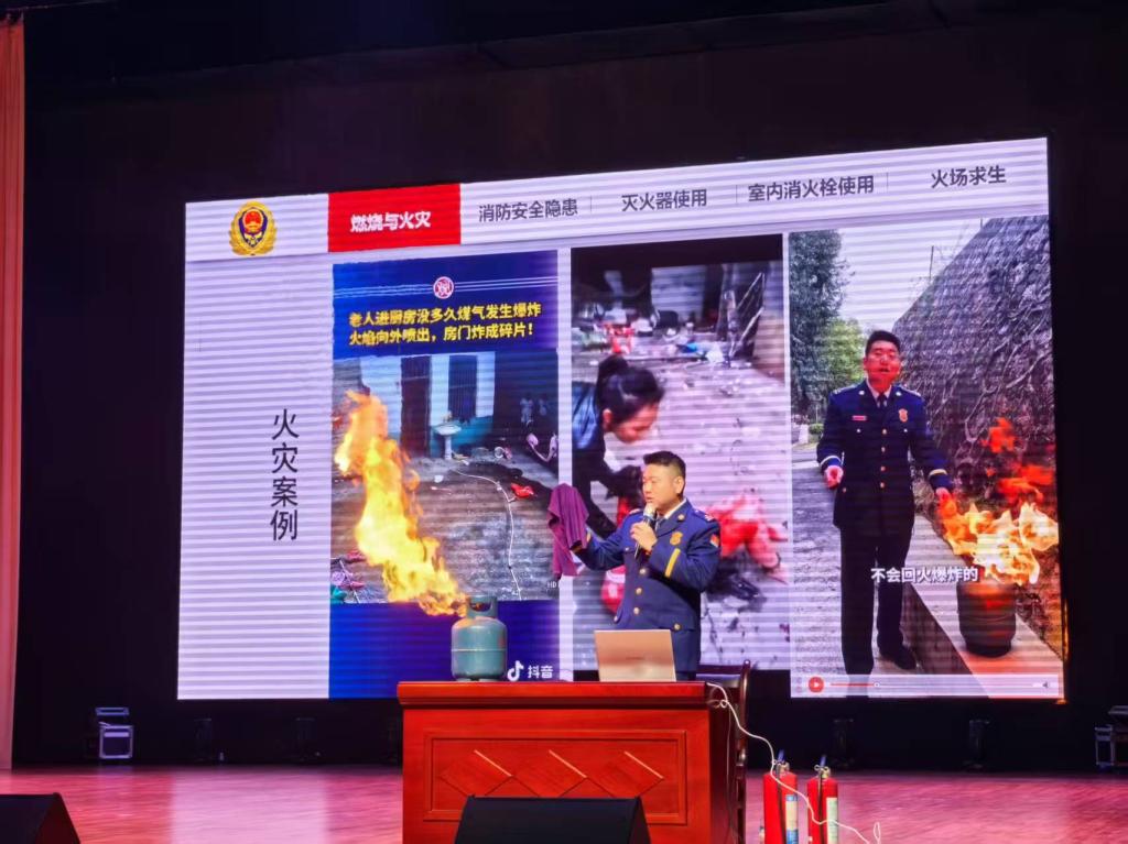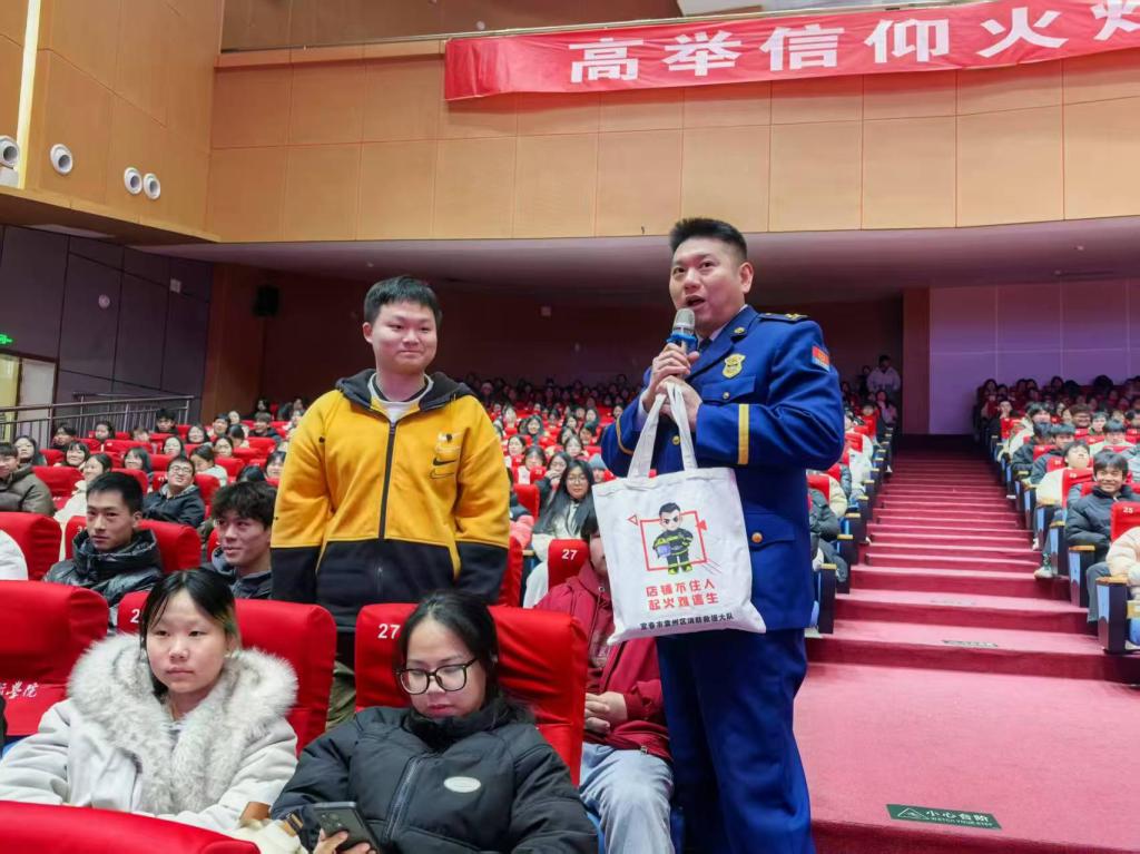 讲座期间,熊康、袁宏伟分别与学生展开现场互动和消防知识有奖竞答,同学们热情高涨,踊跃参与。通过一系列互动环节,不仅加深了学生们对消防安全知识的理解,还激发了他们学习消防安全技能的热情。