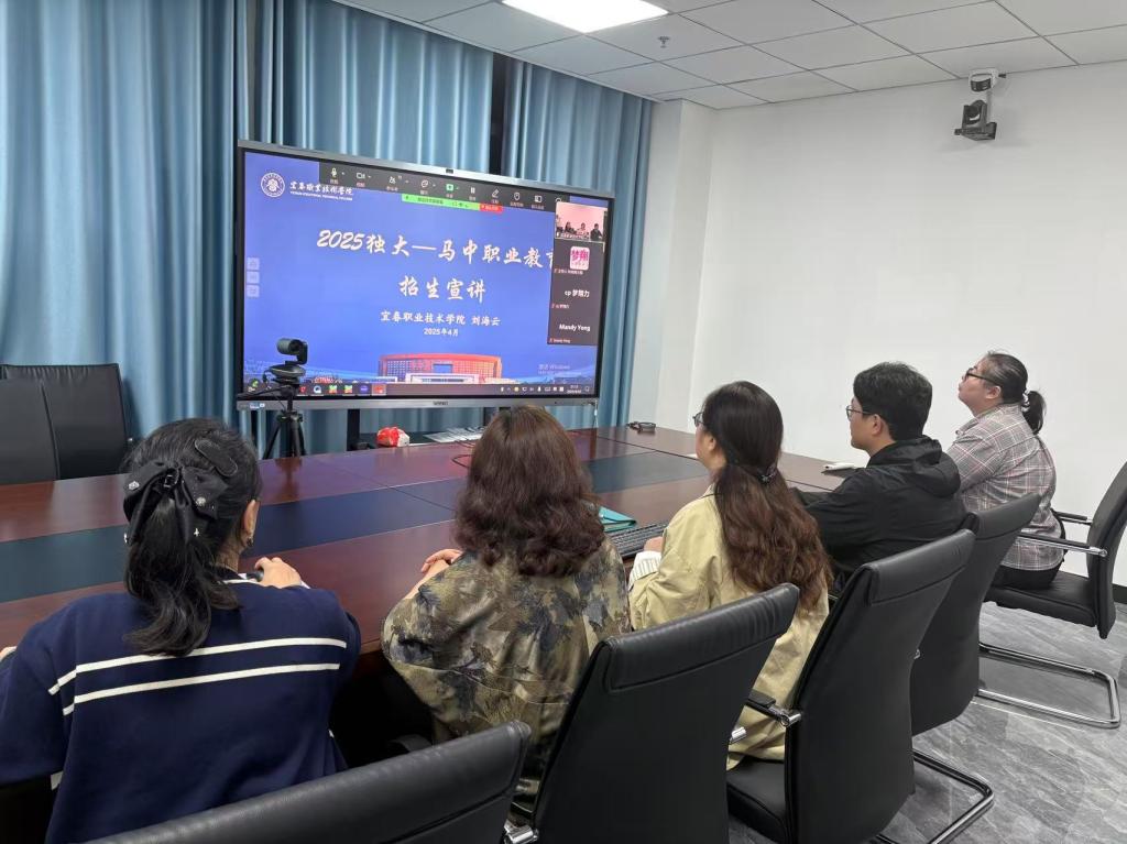 本站讯(国际合作与交流处 王若婷)为全面展示学校办学特色及专业特点,吸引优质海外生源,4月10日晚,国际合作与交流处处长刘海云、医学院和机电与新能源汽车学院专业教师周围、张子涵应邀参加由马来西亚独大教育中心与梦翔力生涯教育工作室联合主办的2025年“AI赋能·产教通融”线上招生宣传讲座。本次讲座通过ZOOM和线上直播同步进行,由梦翔力生涯教育工作室主编林晓薇主持,吸引众多马来西亚学生及其家长听取讲座。