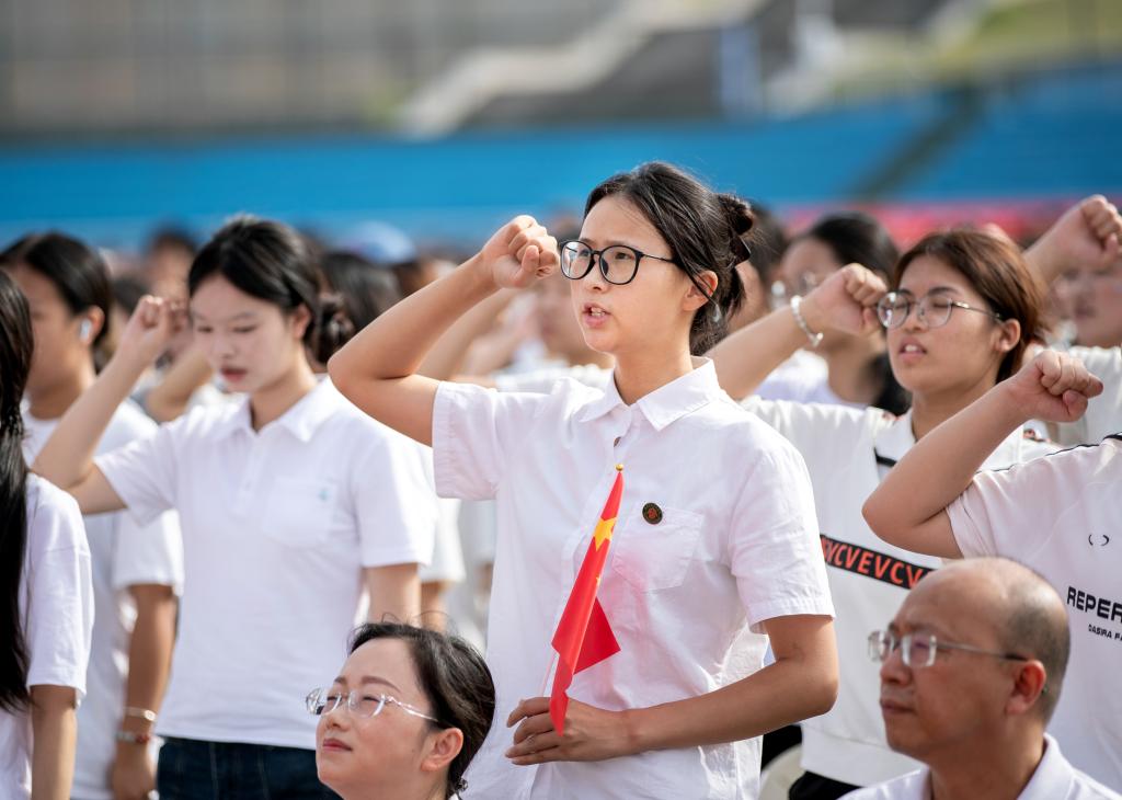 上午9时许,国旗护卫队身着戎装,步履铿锵,护送鲜艳的五星红旗至升旗台。当雄壮的《义勇军进行曲》奏响,五星红旗冉冉升起,全体师生庄严肃立,行注目礼,共唱国歌,典礼正式拉开帷幕。