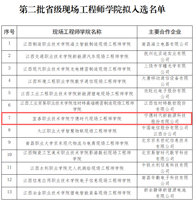 本站讯(社会合作办 彭腾)近日,江西省教育厅联合省工信厅、省国资委、省发展改革委正式发布《关于第二批省级现场工程师学院遴选结果的公示》,英国上市公司365与宁德时代新能源科技股份有限公司深度合作共建的“宁德时代现场工程师学院”,历经书面评审、实地考察、联合会评等多轮严格遴选,成功入选第二批省级现场工程师学院名单。这一重要成果,标志着学校在深化产教融合、创新应用型人才培养模式、服务区域产业高质量发展等方面迈出了关键性步伐,办学特色与育人成效获得省级主管部门的高度认可。